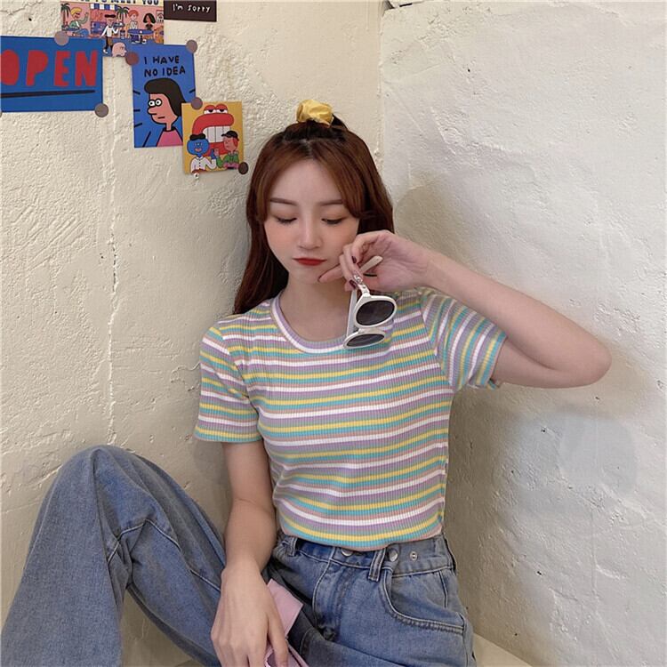韓国ファッション 高弾性 ラウンドネック 短いスタイル トレンド