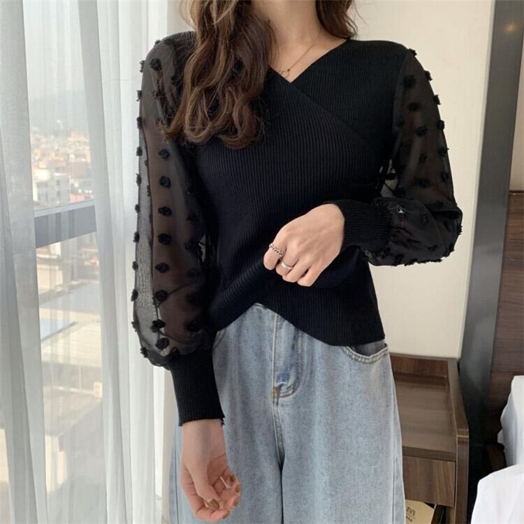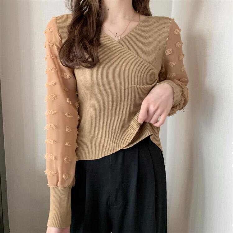 スリム 縫付 シフォン 長袖 ニット トップス 百掛け 上品映え オシャレ
