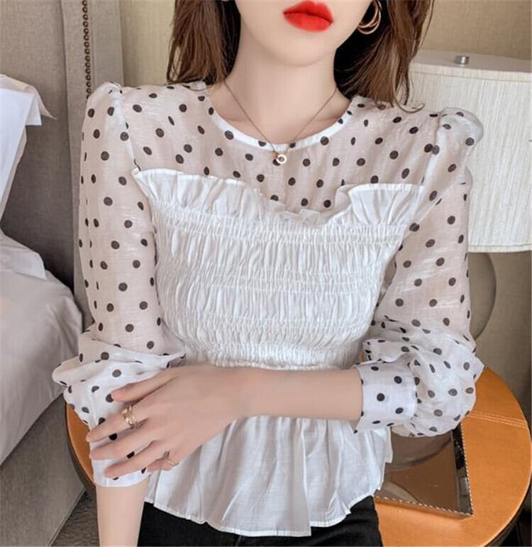 ドット シフォン 縫付 トップス 長袖 シャツ スリムフィット デザインセンス