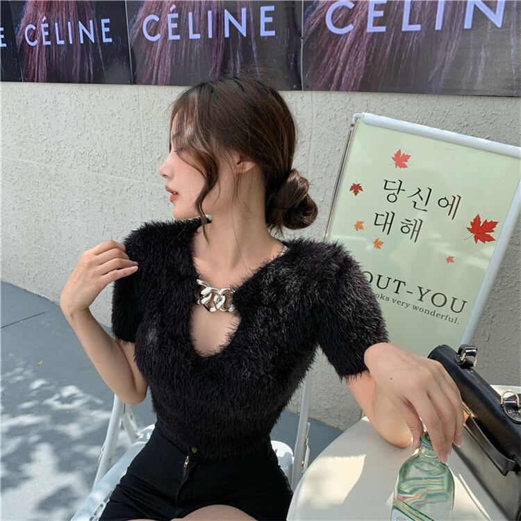 チェーン 透かし彫り オープンウエスト 半袖 デザインセンス トップ カジュアル