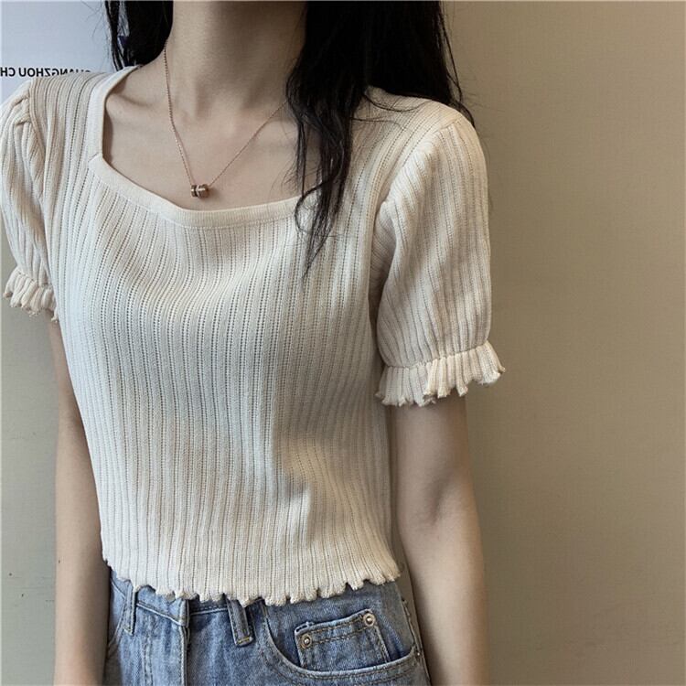 半袖 シンプル トップス 百掛け sweet系 減齢 サマー スリム スクエアネック 短いスタイル ニット