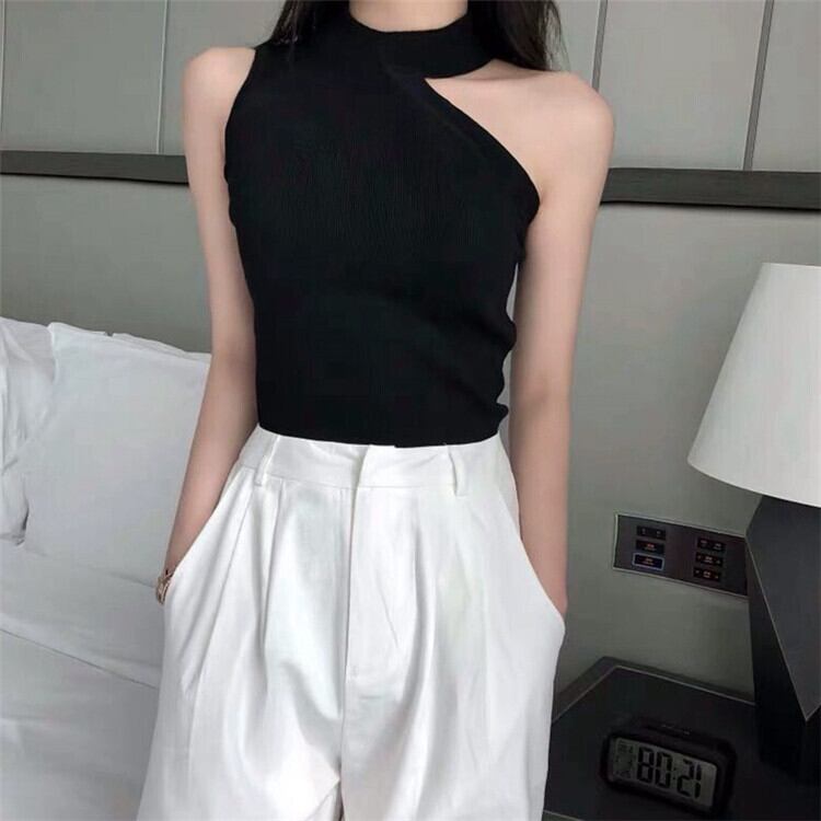 韓国ファッション オフショルダー 袖なし ホルター ニット ベストスリム スリング トップス