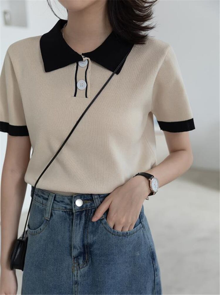 sweet系 コントラストカラー 半袖 ラペル 学生服 ニットトップス Tシャツ